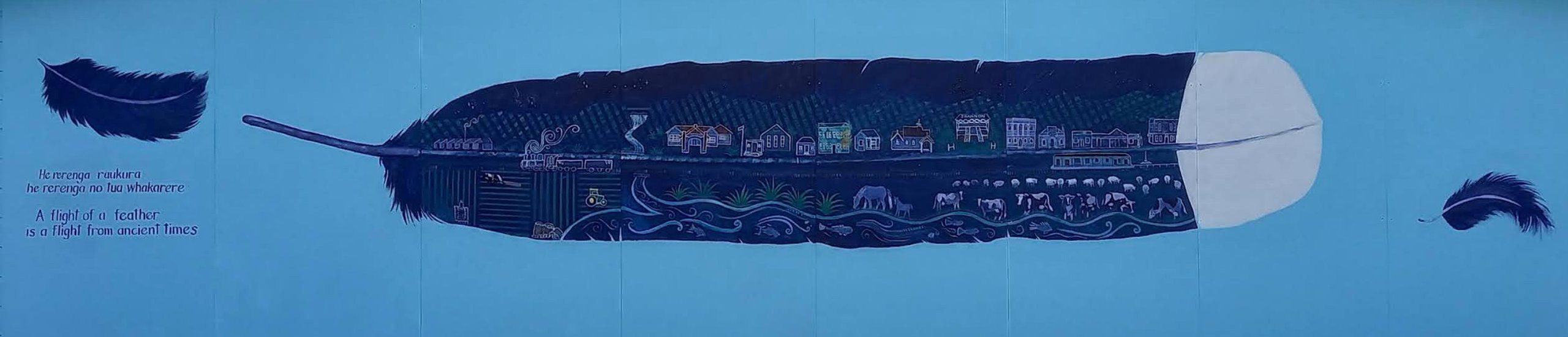We helped to paint the outline of this huge huia feather with colour coding of dark blues and purples. We also painted the enormous white tip of the huia feather. Delphi did the masking tape on the buildings ready for painting plus she painted some of the cows. She is proud of how her draft drawing has created the largest mural on the walls of our kura. She loves how the huia feather floats freely in the breeze. Pa Wylie wrote a whakatauki for this art piece.